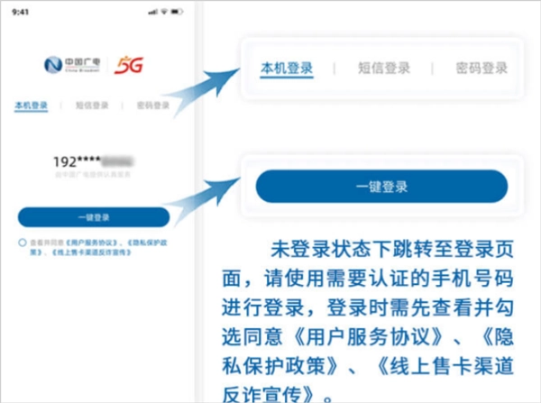 打开中国广电应用后,登录时需使用待认证的手机号码作为账号,具体可通过本机号码一键登录、短信验证码登录或密码登录这三种方式完成操作。