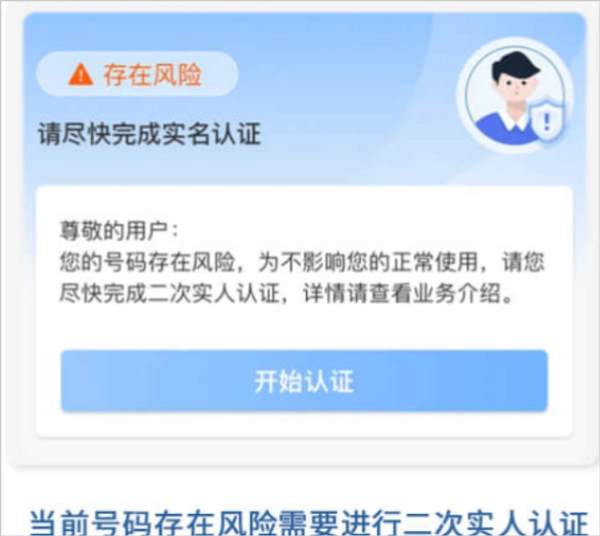 在登录状态下进入二次实人认证页面后,页面会依据号码当前的状态,提示用户是否需要开展二次认证。若号码状态显示为“存在风险”且页面出现“开始认证”按钮,则意味着用户能够通过线上实人认证的途径,解除号码的风险状态。