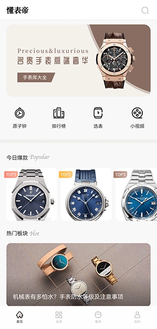 打开懂表帝App后,在首页就能看到时间校准、排行榜、选表模块,还有各种各样的精彩视频内容。