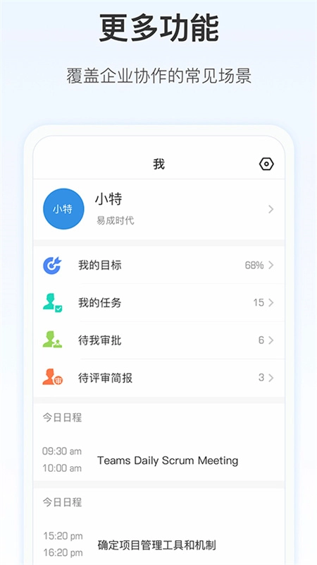 【团队日程管理】支持日、周、月三种视图模式,可共享企业会议、活动及日程安排;借助日程排期助手查看成员的忙闲状态,有效避免日程冲突问题。