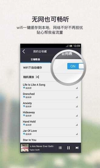 有了WiFi同步功能后,百度音乐能为你在流量消耗方面筑起一道坚实的防线。开启该功能,缓存的歌单和音乐就只会在WiFi模式下运行;一旦脱离WiFi环境,音乐便不会自动加载,从而为你的流量“保驾护航”。