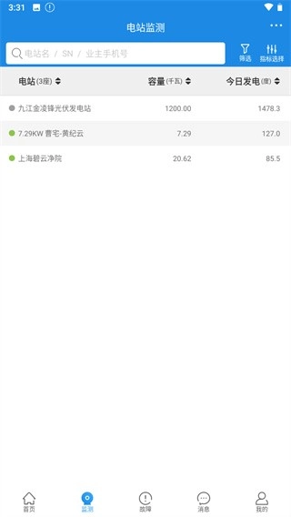 在检测界面,可查看各电站的容量信息以及每日发电状况。