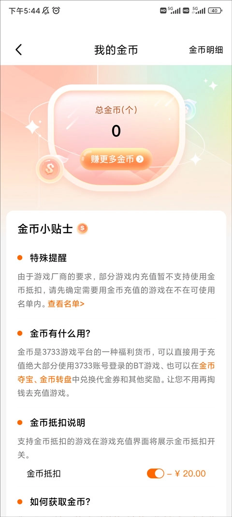 金币是本平台的特殊货币,和平台币相比,它的用途更广、玩法也更丰富。用户能通过完成任务、参与活动、充值等途径获取金币,这些金币可以用来参加金币转盘抽奖,也能在充值游戏时直接支付,还能兑换超值福利(1元人民币可兑换100金币)。