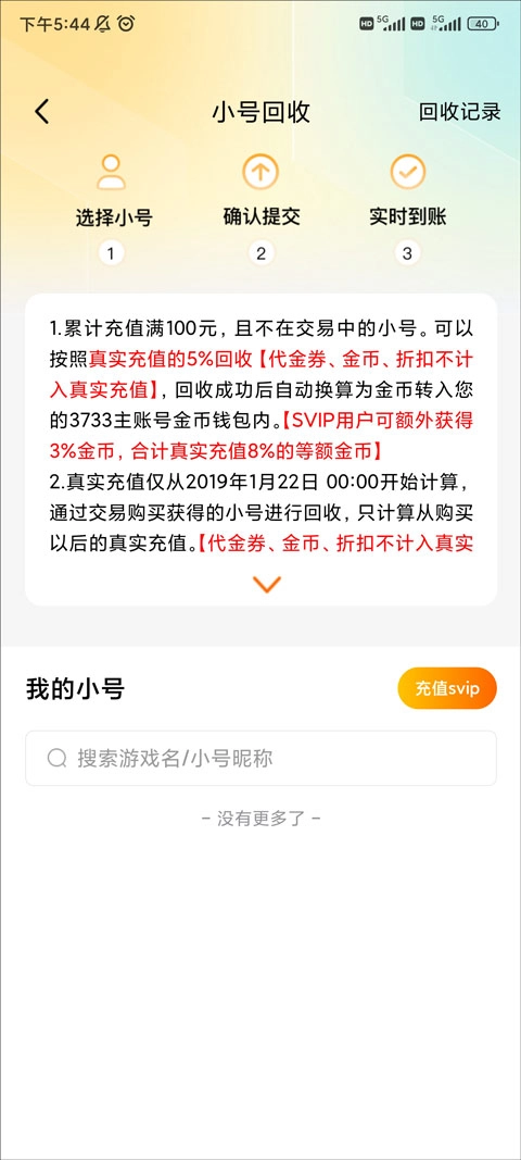 小号回收指的是平台用一定金额回收玩家闲置的多余小号。具体规则如下:累计充值满100元及以上的小号,可按照实际充值金额的5%兑换回收金币;若为之前购买的小号再次申请回收,则仅计算购买后玩家真实充值的部分(金币、代金券不计入内);SVIP用户还能额外获得3%的金币,总计可按充值金额的8%兑换回收金币!回收后的72小时内玩家可申请赎回,超过时限则无法赎回。赎回小号时需收取回收价3%的金币作为手续费,且手续费最低为10个金币。