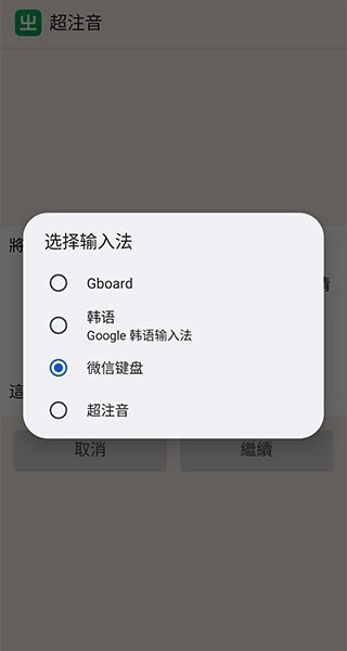 并打开超注音输入法,点击应用图标进入后,会看到下方的引导设置界面,阅读完说明内容后,点击继续按钮即可。