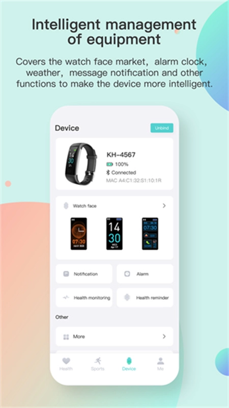 设备智能管理整合了表盘市场、闹钟、天气、消息通知等功能,使手环的智能化程度得到提升。
