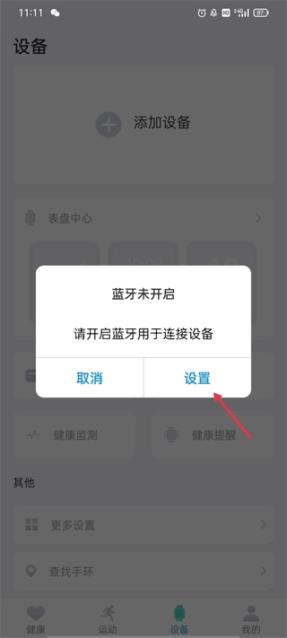 打开软件并登录账号后,会弹出一条提示要求开启蓝牙以连接设备,此时点击“设置”即可。