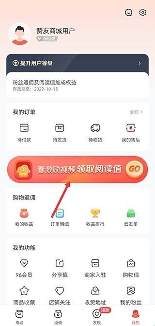打开赞友商城后,进入发现界面,点击观看视频,观看完毕就能得到阅读值奖励。每天最多可观看15次,每次观看一条视频能获得10点阅读值。