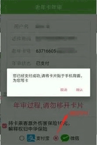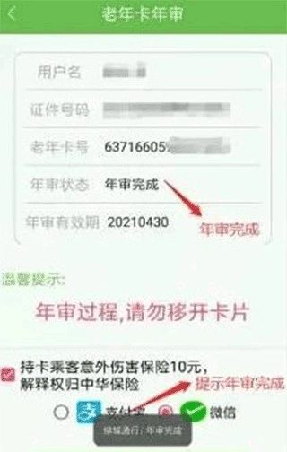 登录系统后回到首页,找到并点击“老年卡年审”功能选项,接着在后续步骤中选择微信或支付宝作为保费支付渠道。