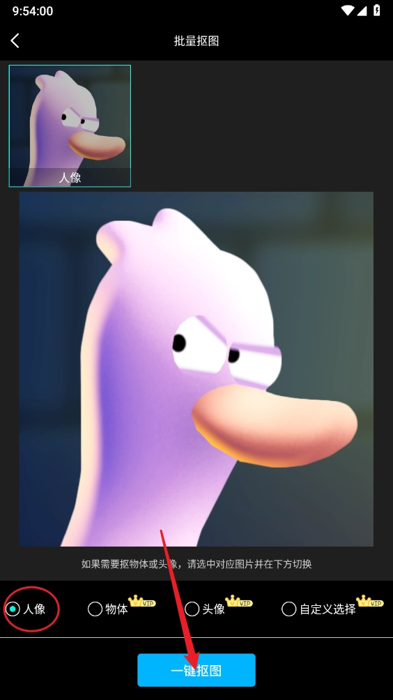 上传所需抠图的图标,勾选人像,点击"一键抠图"。