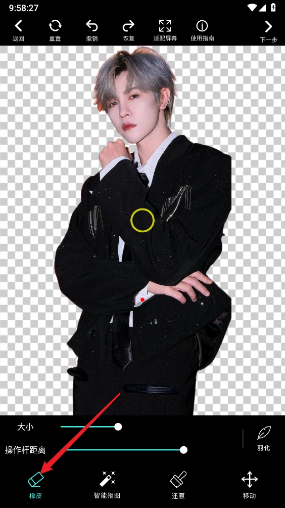选择【橡皮】工具,调节橡皮尺寸与操作杆间距,沿着圆圈轨迹移动直至擦拭干净。