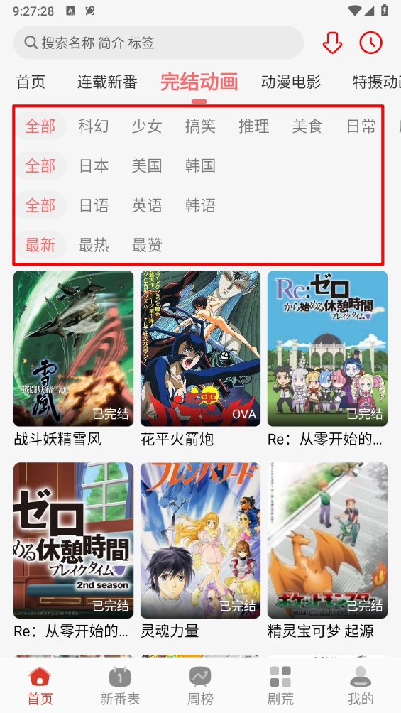 如图所示,切换到“完结动画”页面后,能够依据题材、语言、地区等条件开展筛选操作。