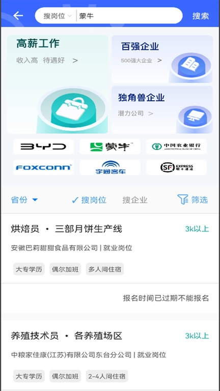 第二步:在实习岗位列表页面顶部的搜索框中输入意向报名的实习企业名称,点击右侧的【搜索】按钮,就能显示出该企业的所有实习岗位。