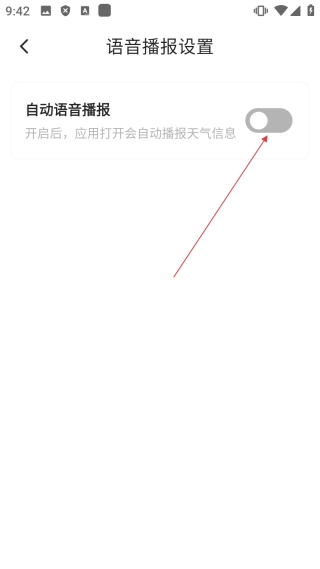 在语音播报设置页面,把【自动语音播报】功能开启后,每次打开该界面就会自动播报天气情况。