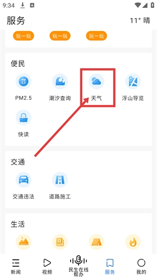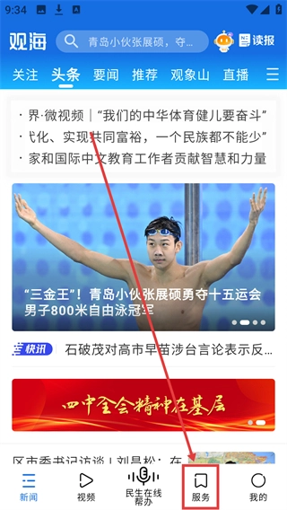 在观海新闻的首页,点击页面底部的【服务】选项,就能进入服务页面,这样就可以准备查询天气信息了。
