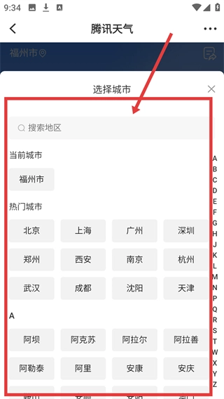 在腾讯天气的界面上,点击左上角显示的城市名称,就能进入到城市选择页面了。