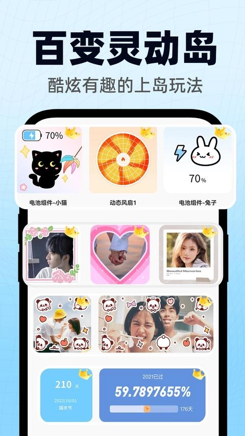 智能小组件是一款多功能的手机工具类应用,当手机执行充电、播放音乐、插入耳机等操作时,它会通过通知栏向您发送提醒;您还能自定义灵动岛的尺寸与位置,让手机界面更具美感。