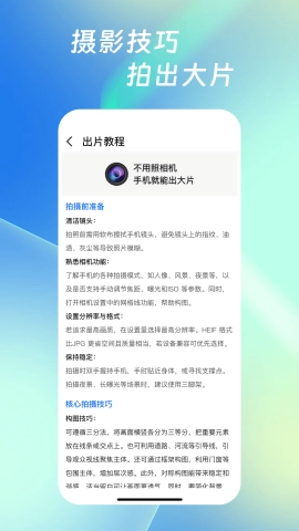 多种摄影技巧教程,帮助用户轻松拍出具有大片质感的照片,提升摄影水平。