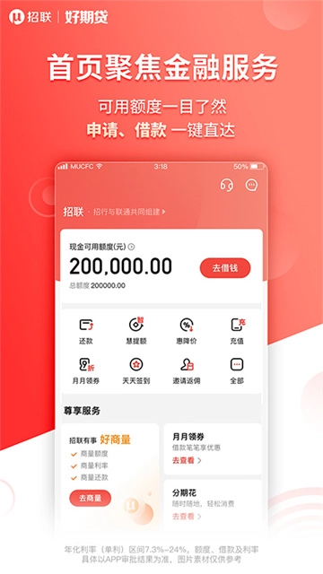 低门槛纯信用模式:无需抵押担保,仅凭身份证就能在线提交申请,只要年满18岁、信用状况良好且拥有稳定收入的用户都可以尝试申请,极大地降低了贷款申请的准入门槛。
