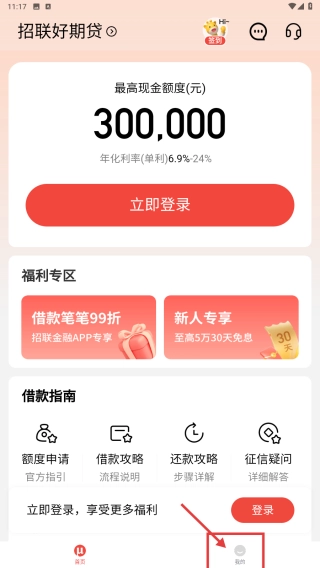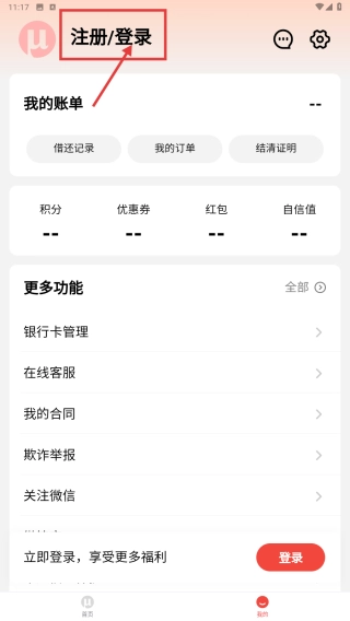 打开借贷类应用后,点击底部导航栏中的“我的”选项,即可进入个人中心页面。