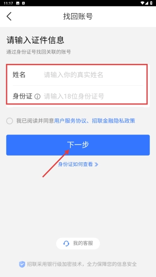 在账号找回页面,填写姓名与身份证号码后,点击“下一步”按钮,即可继续推进账号找回的后续流程。