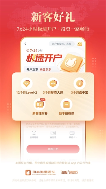 想要快速完成国泰君安君弘的开户流程,只需进入开户页面,根据提示选择合适的开户类型,完成身份验证后就能零元开户。整个过程支持7×24小时全天候操作,开户流程可急速完成。