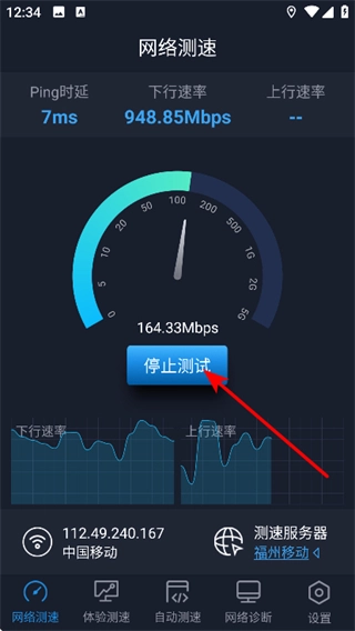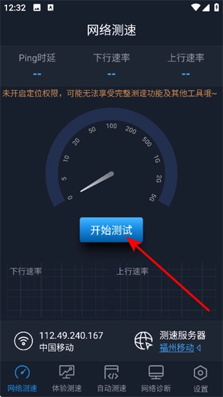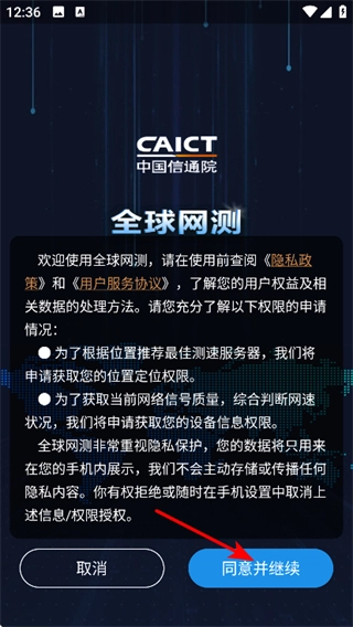 在权限申请弹窗里,点击同意并继续,就能进入网络测速页面。