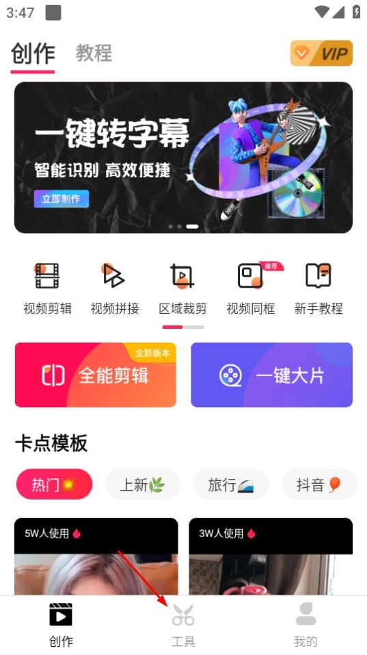打开爱剪辑后,如果需要使用工具相关的功能,可以点击页面底部的工具按钮。