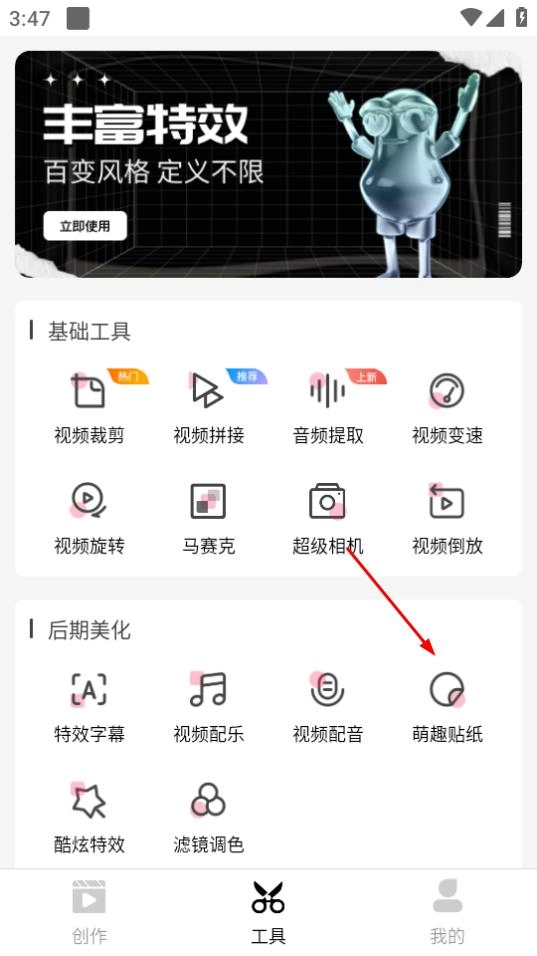 在工具页面,若想使用萌趣贴纸功能,点击萌趣贴纸即可。