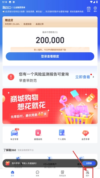 打开融360金融应用,点击底部的“我的”选项,即可进入个人中心页面。