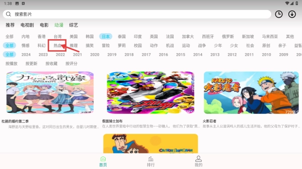 在日本动漫的列表里,选择热血题材的选项,就能筛选出属于热血类别的日本动漫。
