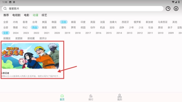 在热血类日本动漫的列表里,定位到目标动漫《火影忍者》,然后点击进入查看它的详细信息。