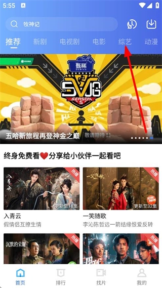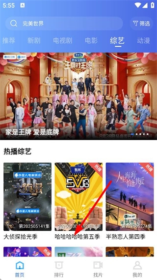 在视频类首页,点击顶部的综艺标签,即可进入综艺页面。