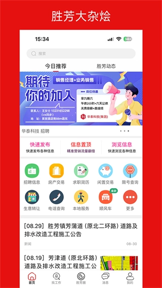 构建胜芳圈社交广场与互助社区,为用户提供发布图文、视频动态的功能,助力大家分享生活中的所见所闻;同时划分失物招领、顺风车等不同板块,便于邻里之间求助答疑,进一步强化彼此的联结。