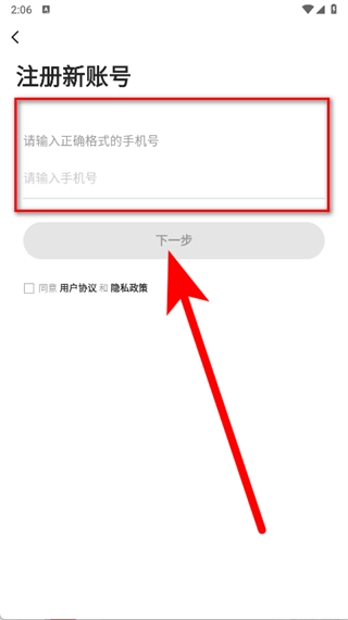 在新账号注册页面,输入格式正确的手机号,勾选相关选项后点击下一步,即可完成注册流程。