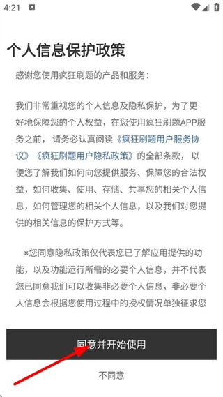 在个人信息保护政策页面,点击“同意并开始使用”按钮,即可进入登录页面。