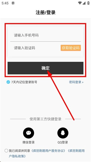 在注册或登录页面,输入手机号码与验证码,点击确定按钮,即可完成登录或注册流程。