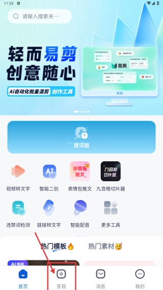 打开视频创作类应用后,点击底部的变现选项,即可进入变现功能页面。