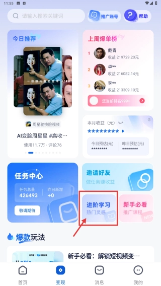 在变现功能页面,点击进阶学习板块,就能进入灵感教程列表页。