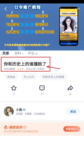 在教程详情页面,查看口令推广的教程步骤以及相关的灵感内容,学习视频创作与推广的技巧。