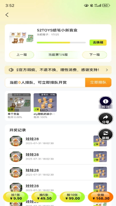 具备趣味抽奖功能,用户可以参与多种抽奖活动,赢取公仔、挂件、摆件等丰富奖品。