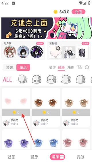 在萌铺页面挑选心仪的装扮单品,然后进入该单品的详情页面。