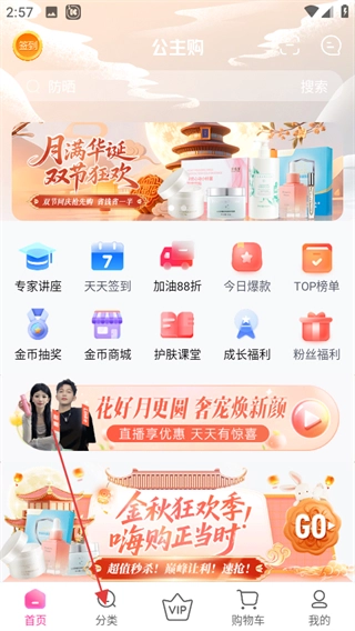 进入公主购首页,点击底部分类,进入分类页面。