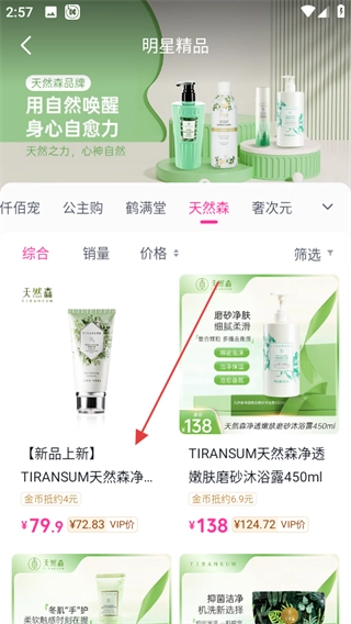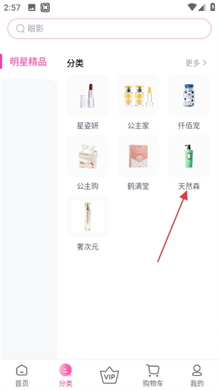 在分类页面中,点击“天然森”选项,即可进入天然森品牌的商品列表页面。