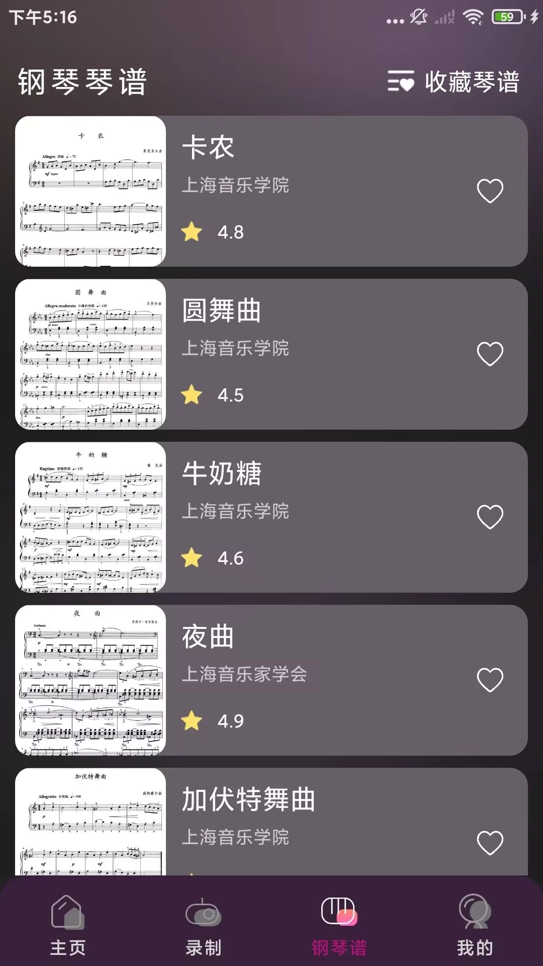 支持对琴谱和歌曲进行收藏操作,把心仪的曲谱以及录制好的歌曲收藏起来,这样后续查找和使用时会更便捷。