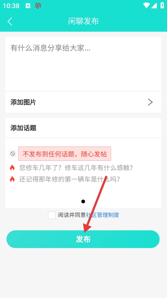 在闲聊发布页面,输入你想分享的内容,还能添加图片、话题等元素,之后点击【发布】按钮,就能成功发布一条闲聊帖了。