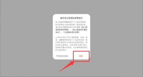 在服务条款和隐私声明窗口中点击“同意”按钮,就能进入钱儿频道应用。
