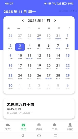 在日历页面,你可以实时查看每一天对应的阴历和阳历日期,还能了解到当天是否有节假日安排。