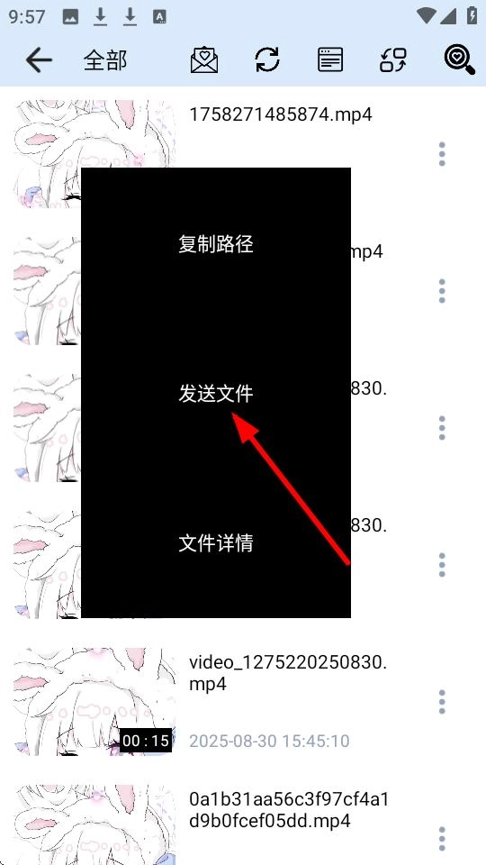 在【全部】页面,点击视频右侧的三点图标,接着选择【发送文件】选项,就能完成文件发送的操作。