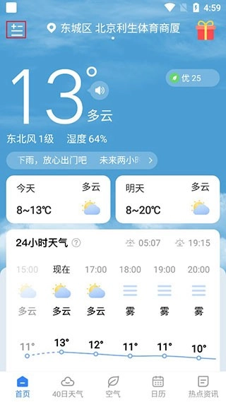 查看天气:在主界面可查看当前天气信息,涵盖温度、湿度、风速等内容。